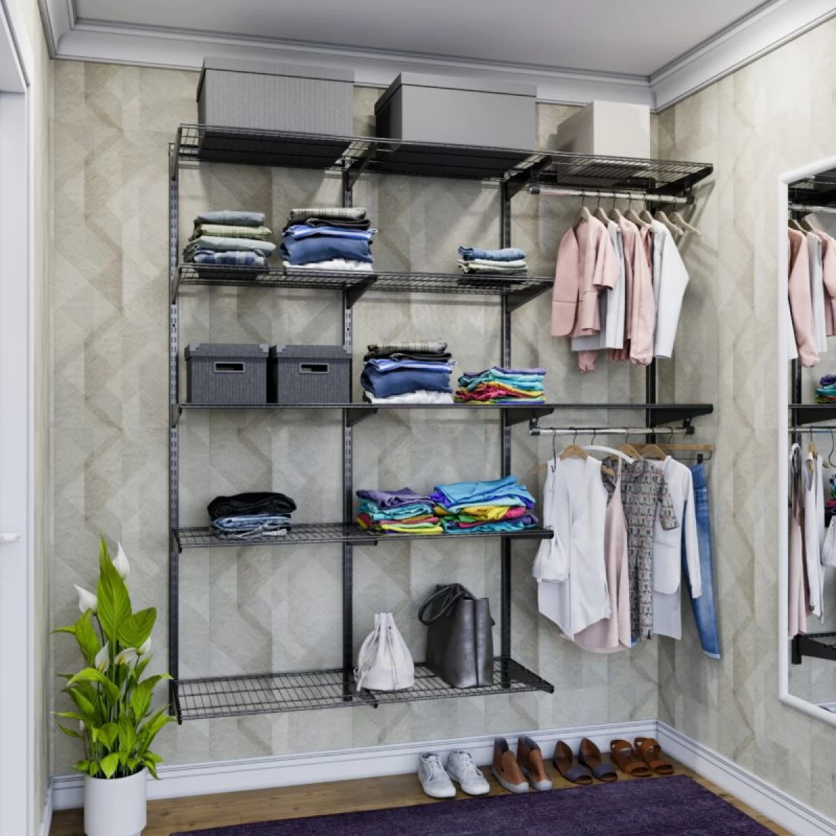 В комплект входят несущие рельсы и навесные направляющие, полки, штанги, аксессуары, крепежные элементы. Можно докупить множество дополнительных компонентов для гардеробной системы.
