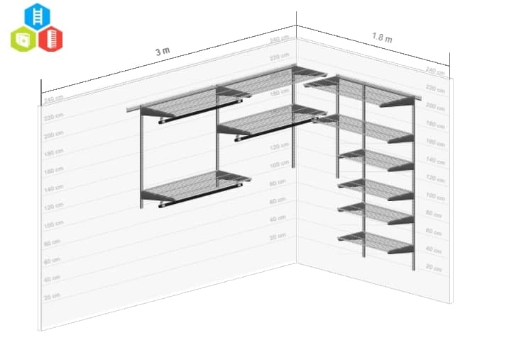 Базовый комплект гардеробной системы GS - это готовое решение для квартиры, дачи, гаража, обеспечивающее удобное хранение вещей. Система собирается в 6 разных конфигурациях, что позволяет подстраивать ее под размеры помещения и ориентироваться на личные пожелания по расположению отдельных элементов. В комплект входят несущие рельсы и навесные направляющие, полки, штанги, аксессуары, крепежные элементы. Можно докупить множество дополнительных компонентов для гардеробной системы.