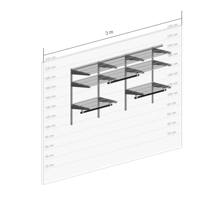 Базовый комплект гардеробной системы GS - это готовое решение для квартиры, дачи, гаража, обеспечивающее удобное хранение вещей. Система собирается в 6 разных конфигурациях, что позволяет подстраивать ее под размеры помещения и ориентироваться на личные пожелания по расположению отдельных элементов. В комплект входят несущие рельсы и навесные направляющие, полки, штанги, аксессуары, крепежные элементы. Можно докупить множество дополнительных компонентов для гардеробной системы.