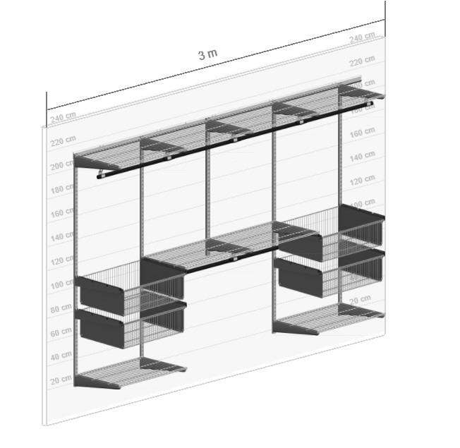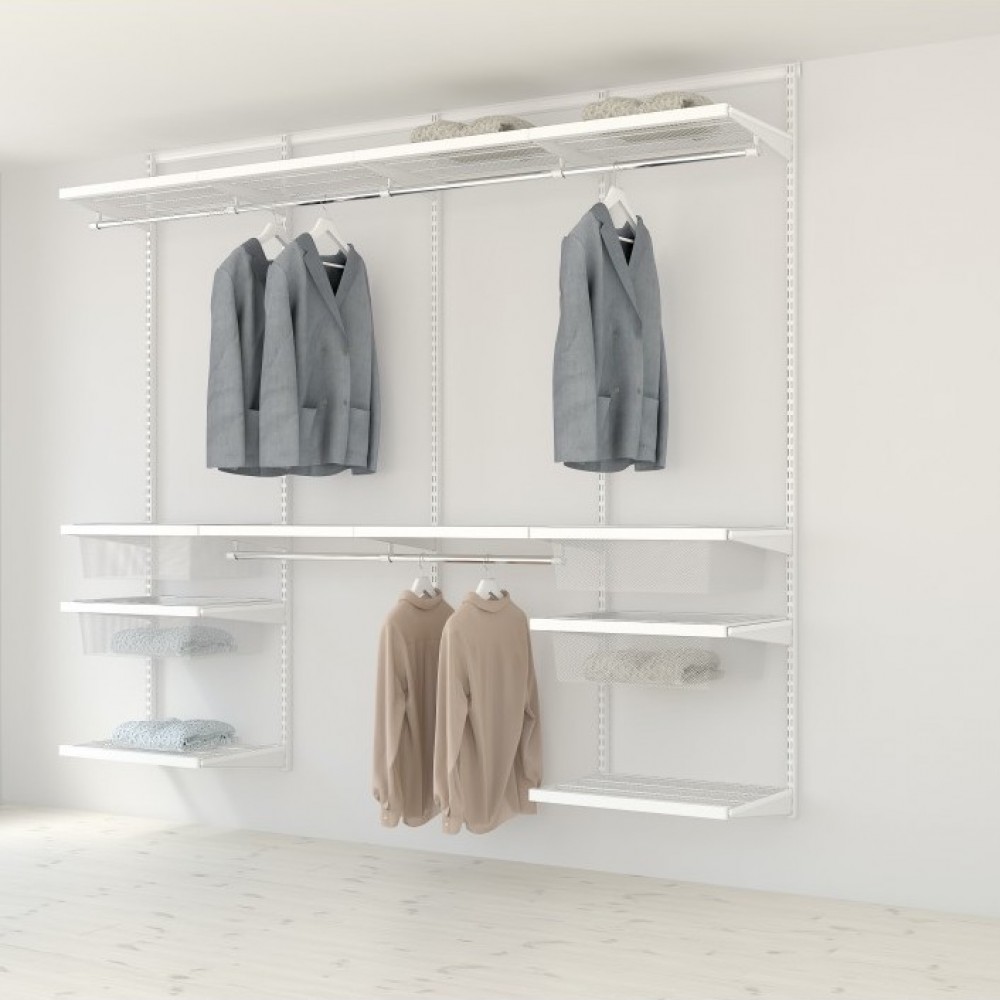 В комплект входят несущие рельсы и навесные направляющие, полки, штанги, аксессуары, крепежные элементы. Можно докупить множество дополнительных компонентов для гардеробной системы.