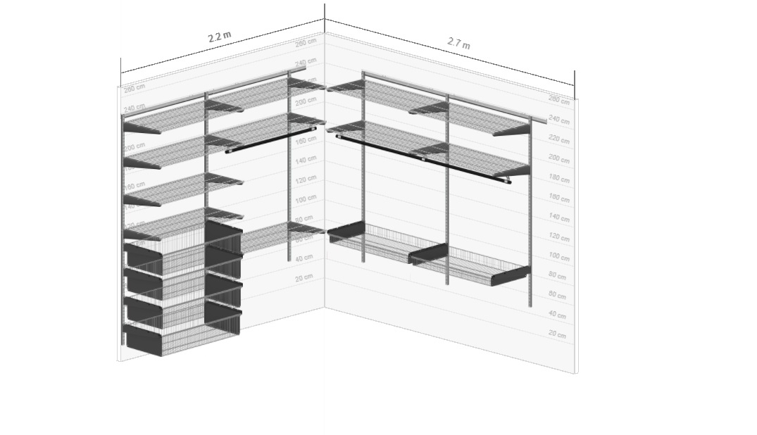 Базовый комплект гардеробной системы GS - это готовое решение для квартиры, дачи, гаража, обеспечивающее удобное хранение вещей. Система собирается в 6 разных конфигурациях, что позволяет подстраивать ее под размеры помещения и ориентироваться на личные пожелания по расположению отдельных элементов. В комплект входят несущие рельсы и навесные направляющие, полки, штанги, аксессуары, крепежные элементы. Можно докупить множество дополнительных компонентов для гардеробной системы.