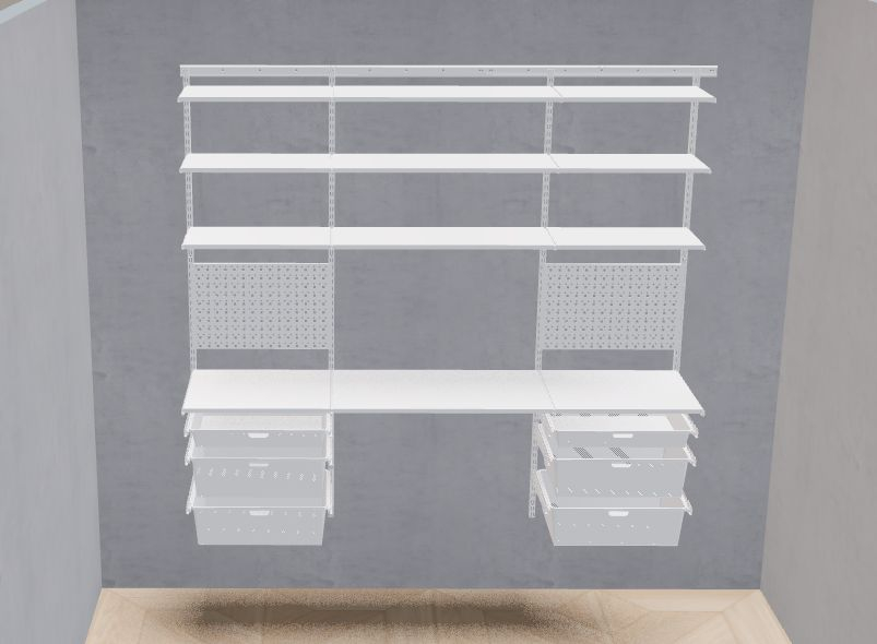 В комплект входят несущие рельсы и навесные направляющие, полки, штанги, аксессуары, крепежные элементы. Можно докупить множество дополнительных компонентов для гардеробной системы.