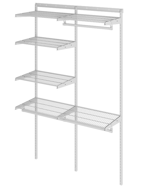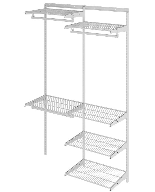 В комплект входят несущие рельсы и навесные направляющие, полки, штанги, аксессуары, крепежные элементы. Можно докупить множество дополнительных компонентов для гардеробной системы.