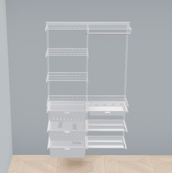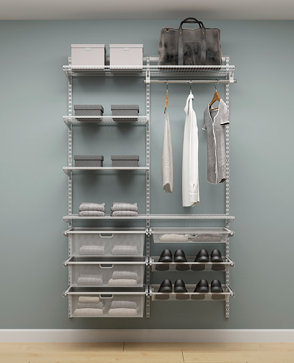 В комплект входят несущие рельсы и навесные направляющие, полки, штанги, аксессуары, крепежные элементы. Можно докупить множество дополнительных компонентов для гардеробной системы.