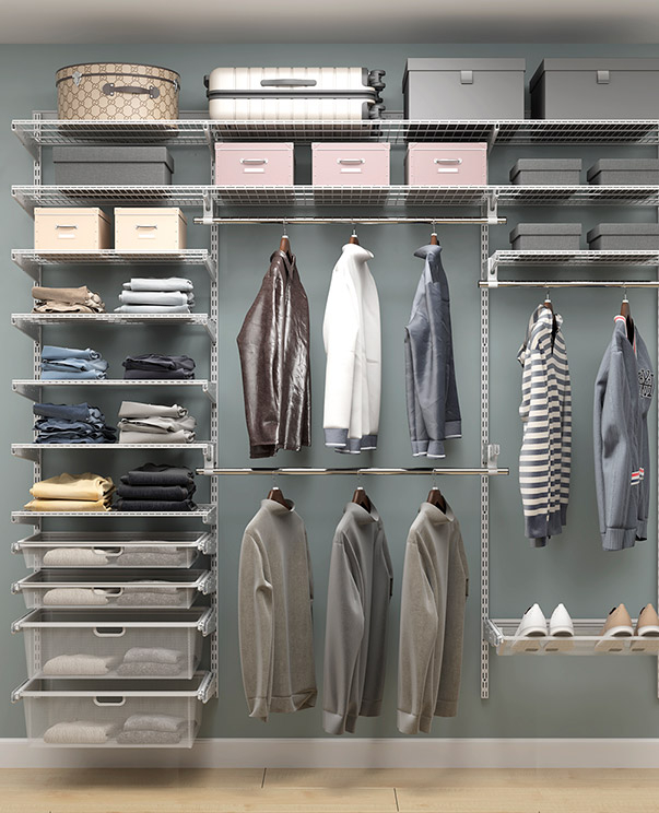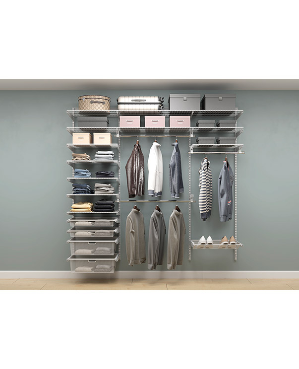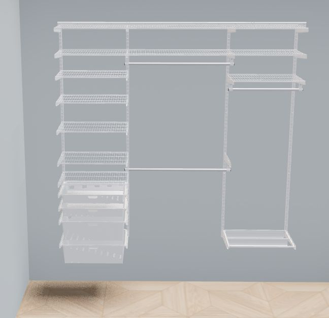 В комплект входят несущие рельсы и навесные направляющие, полки, штанги, аксессуары, крепежные элементы. Можно докупить множество дополнительных компонентов для гардеробной системы.