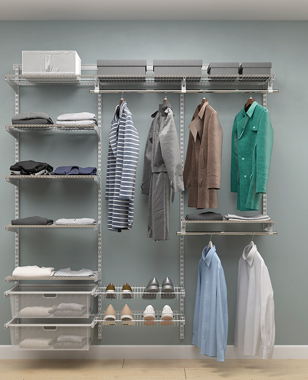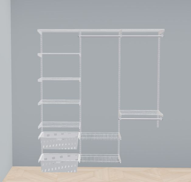 В комплект входят несущие рельсы и навесные направляющие, полки, штанги, аксессуары, крепежные элементы. Можно докупить множество дополнительных компонентов для гардеробной системы.