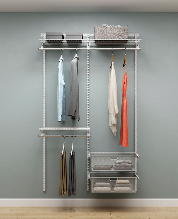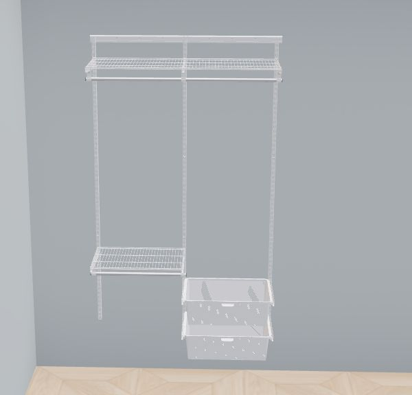 В комплект входят несущие рельсы и навесные направляющие, полки, штанги, аксессуары, крепежные элементы. Можно докупить множество дополнительных компонентов для гардеробной системы.