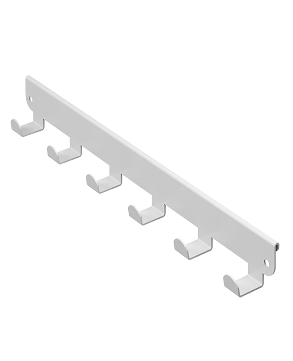 Крючки боковые представляют собой металлическую планку на 6 или 8 крючков (для кронштейнов глубиной 335 и 435 мм), которая навешивается на внешнюю боковую поверхность кронштейна в гардеробной системе ПРАКТИК Home.