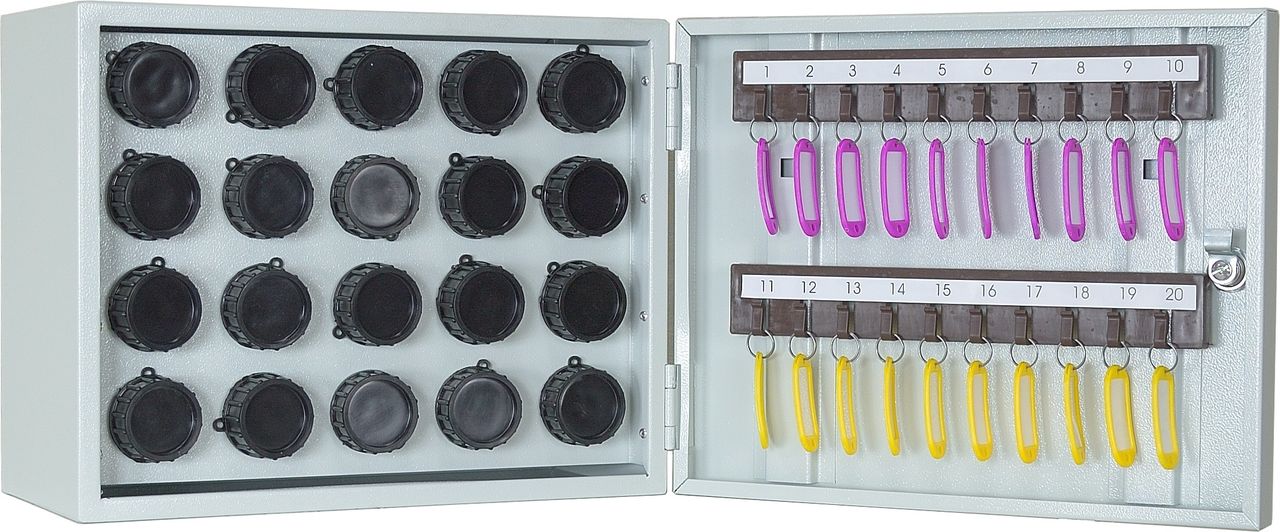 Пенальница КЛ-20П предназначена для хранения 20 комплектов ключей и 20 пеналов. На задней стенке корпуса расположены отверстия для крепления. Ключница комплектуется 2 планками под навеску ключей. В дверь установлен замок типа «Cam-Lock». По желанию заказчика пенальница может комплектоваться пеналами.