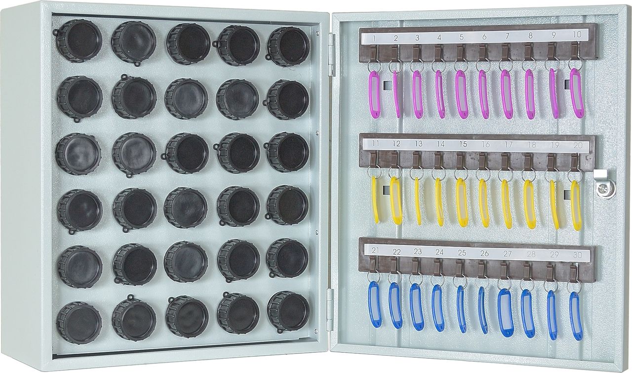 Пенальница КЛ-30П предназначена для хранения 30 комплектов ключей и 30 пеналов. На задней стенке корпуса расположены отверстия для крепления. Ключница комплектуется 3 планками под навеску ключей. В дверь установлен замок типа «Cam-Lock». По желанию заказчика пенальница может комплектоваться пеналами.