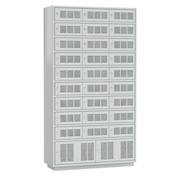 Двадцать семь запираемых ячеек с габаритами (ВхШхГ) в мм: 155х360х370, в верхней части шкафа, 9 рядов по 3 ячейки.