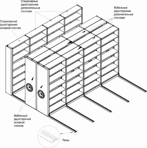 - предназначен для оборудования архива компактного хранения документов в офисе и создания крупных архивов и книгохранилищ;