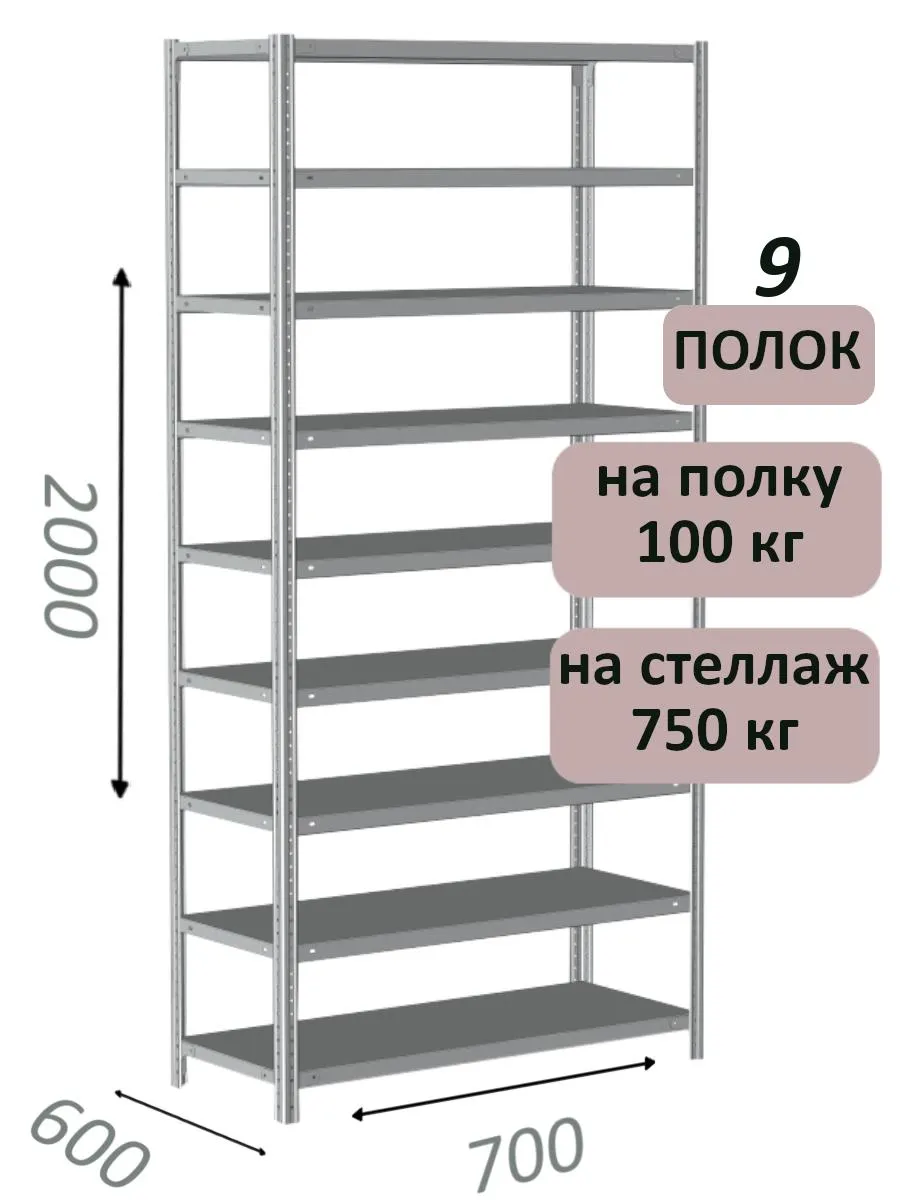 Стеллаж металлический полочный МС 2000х700х600, 9 полок, 100 кг на полку, светло-серый
