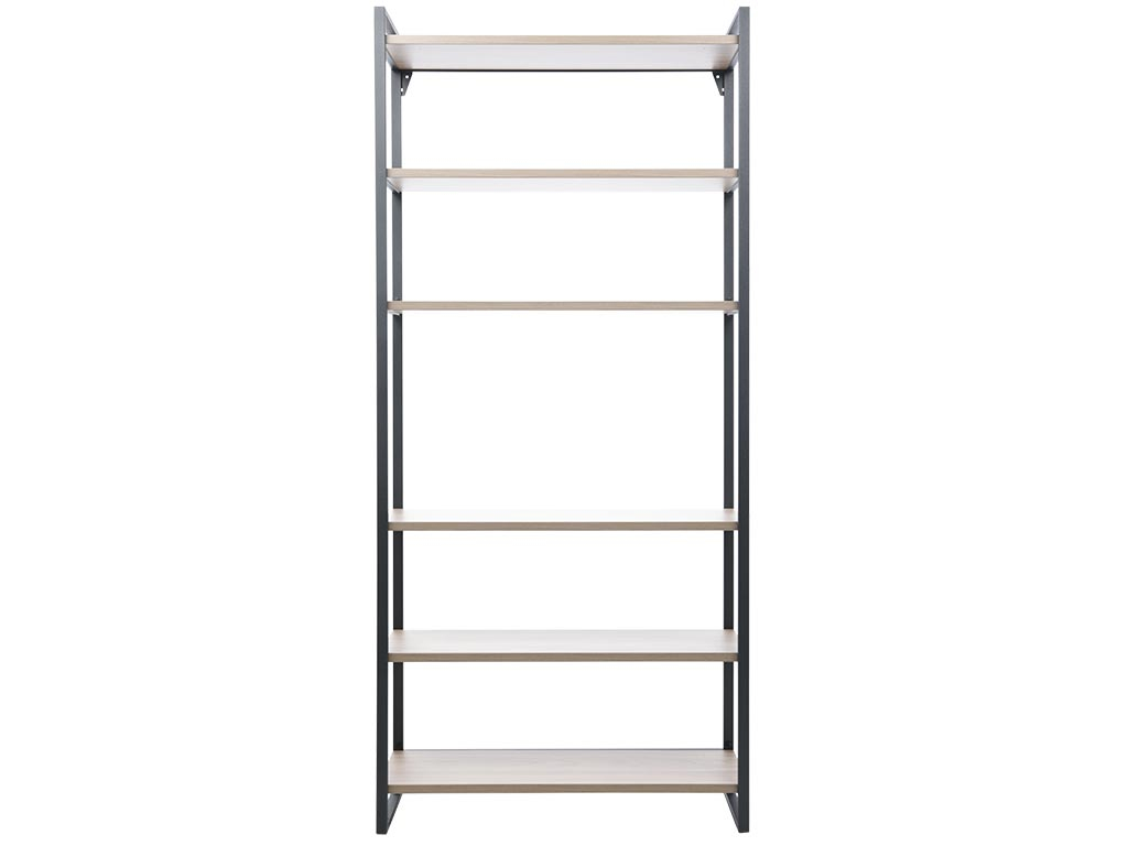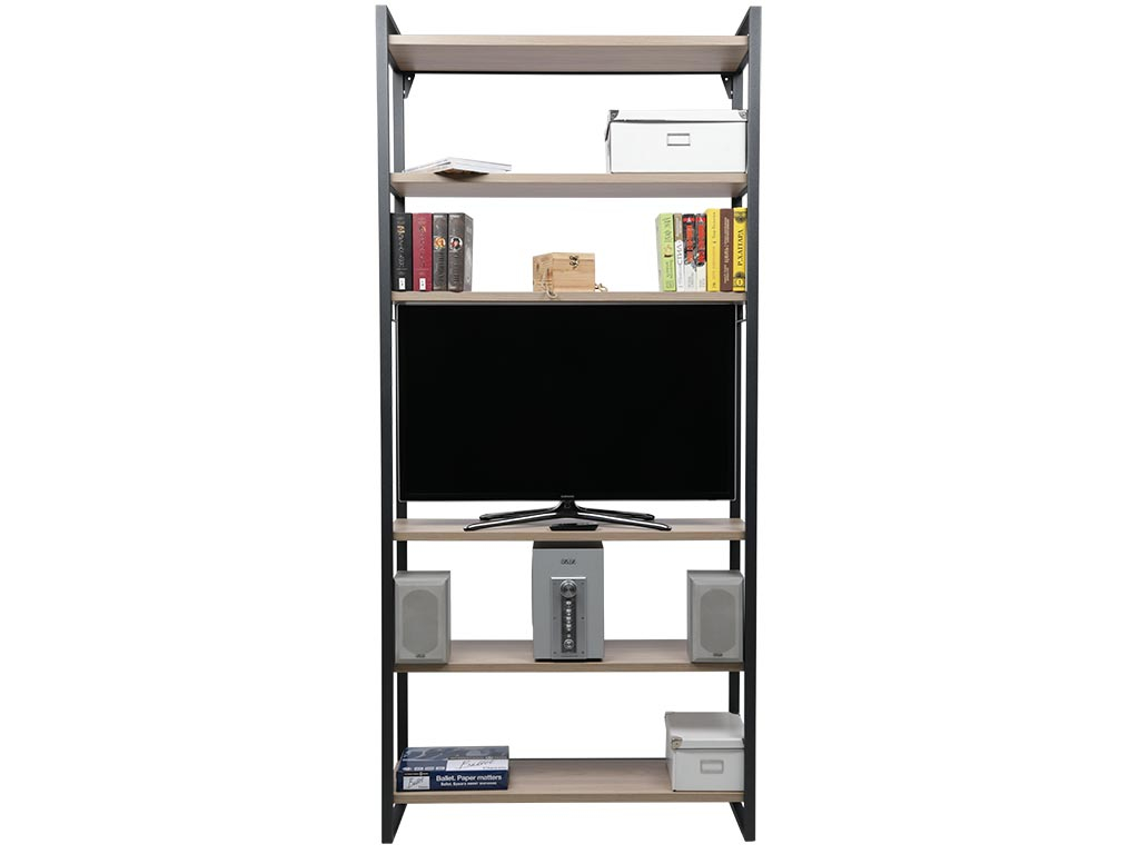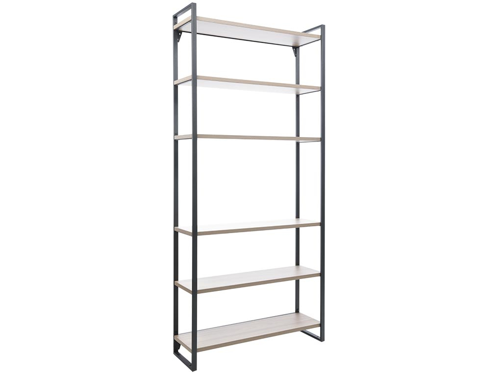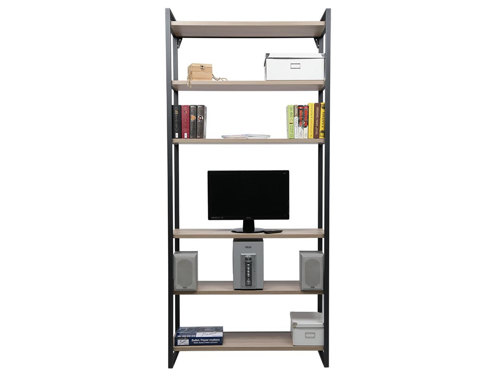 Полки стеллажа выполнены из ЛДСП Вяз натуральный, толщиной 25 мм, с лазерной ABS кромкой толщиной 2 мм с полимерным функциональным слоем (Германия), которая обеспечивает эффект нулевого шва и улучшает влагостойкость и термостойкость элементов фасада