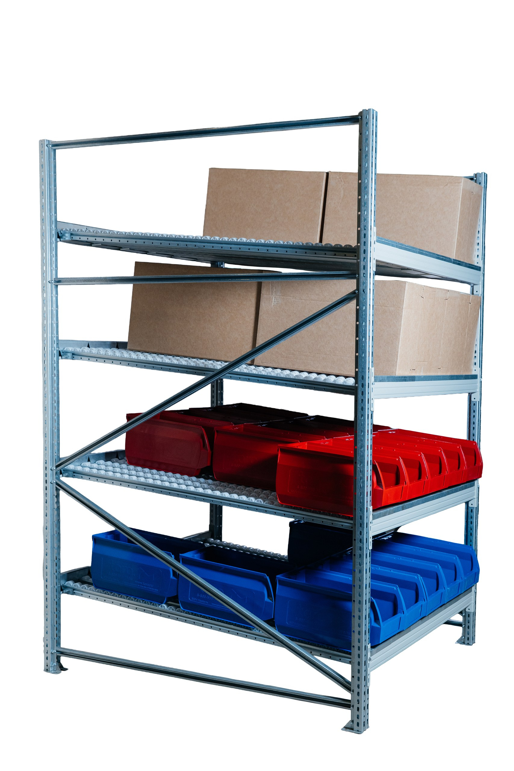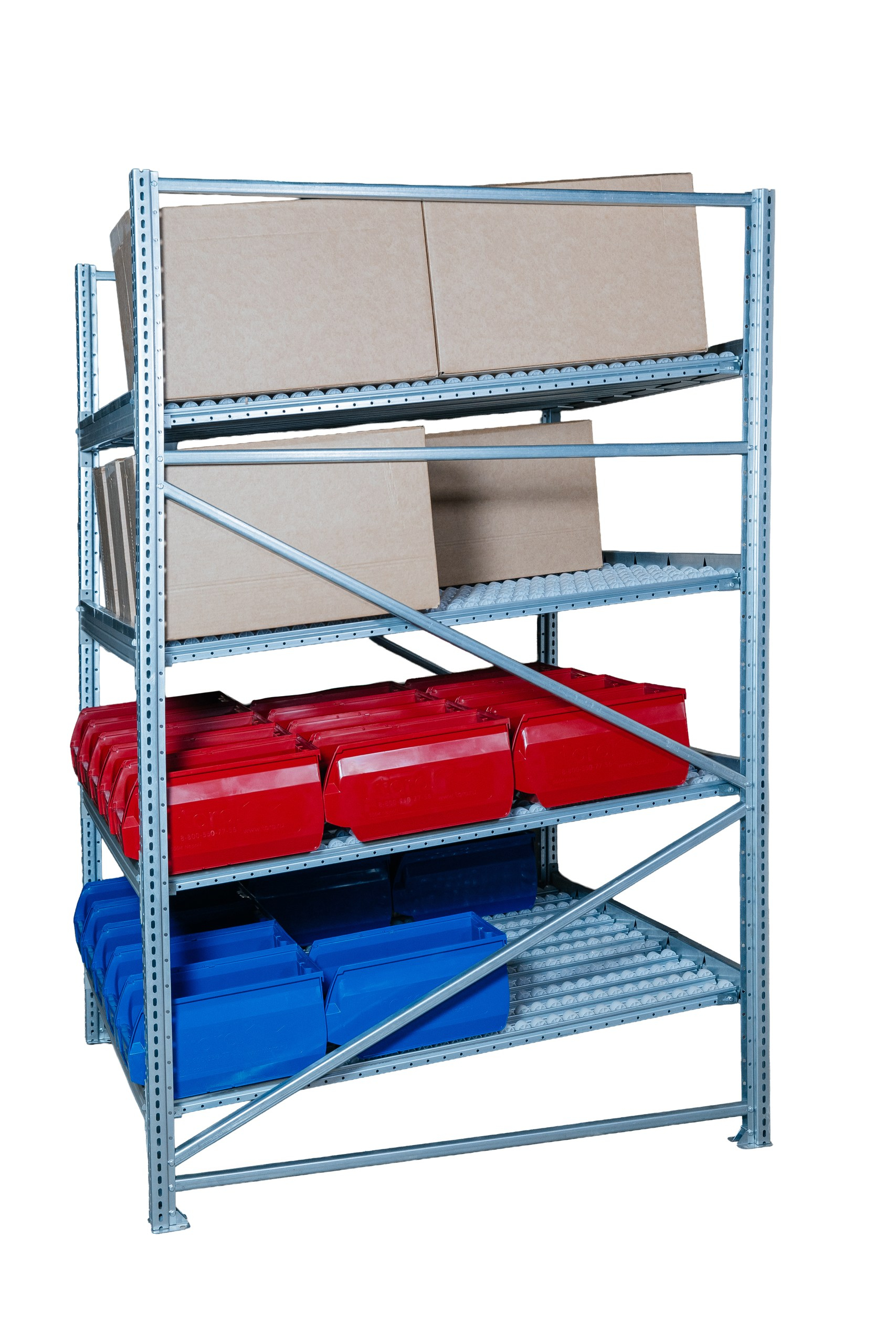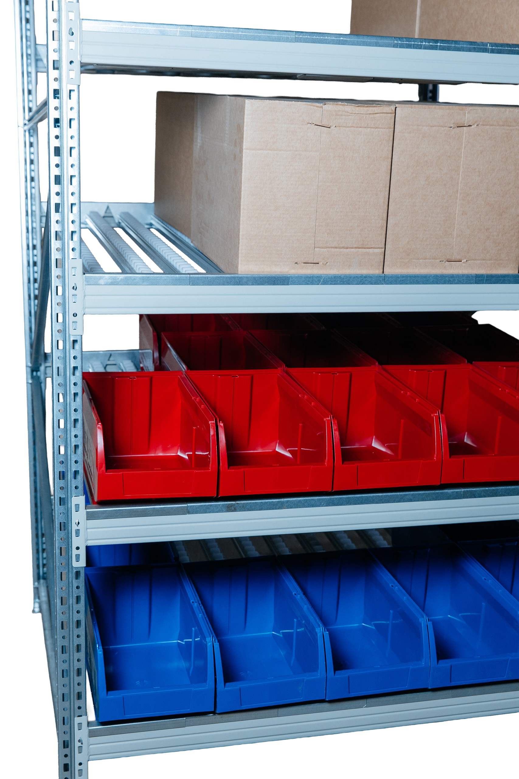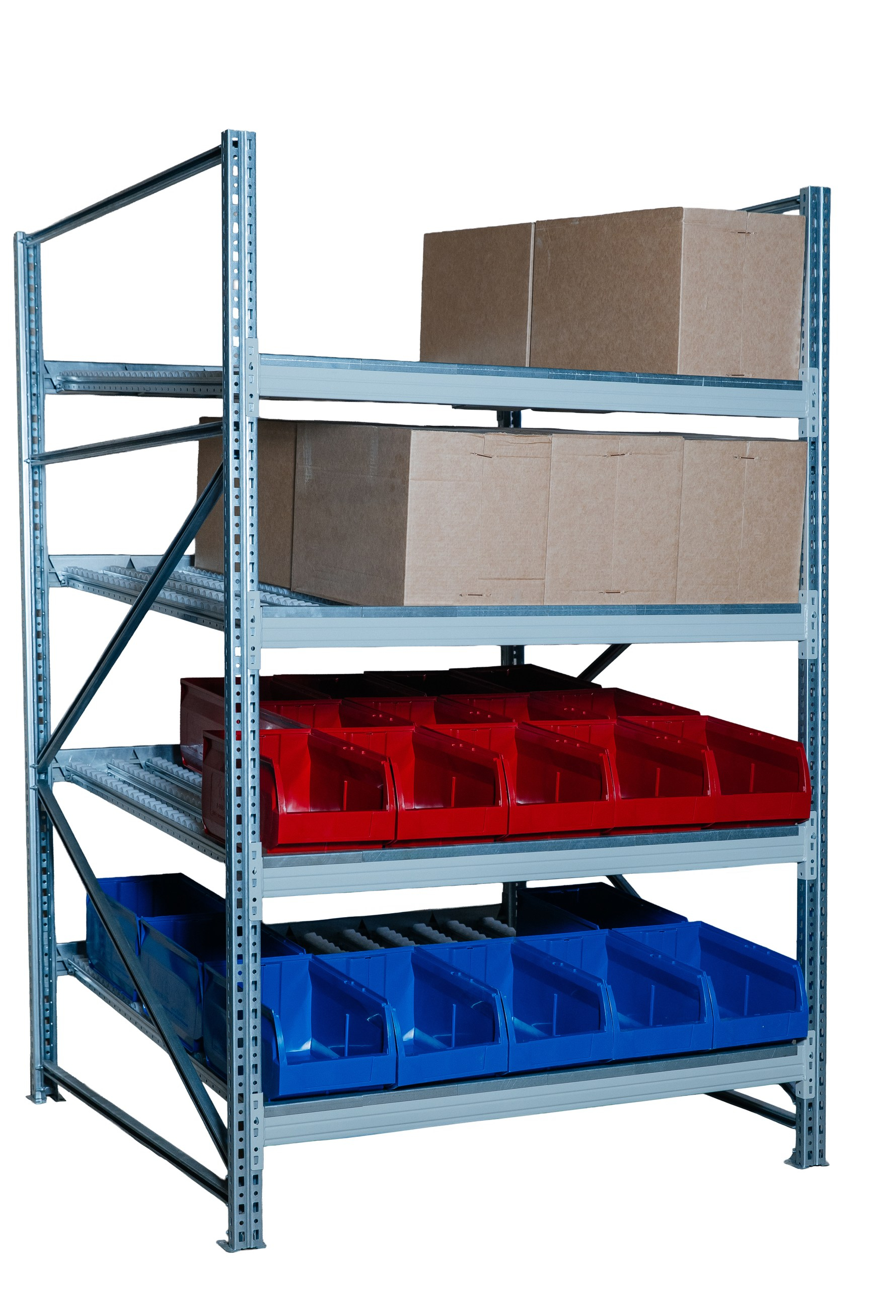За счёт роликовых дорожек стеллаж помогает поддерживать порядок на складе, улучшает визуальный контроль остатков и делает процесс пополнения более удобным и быстрым.