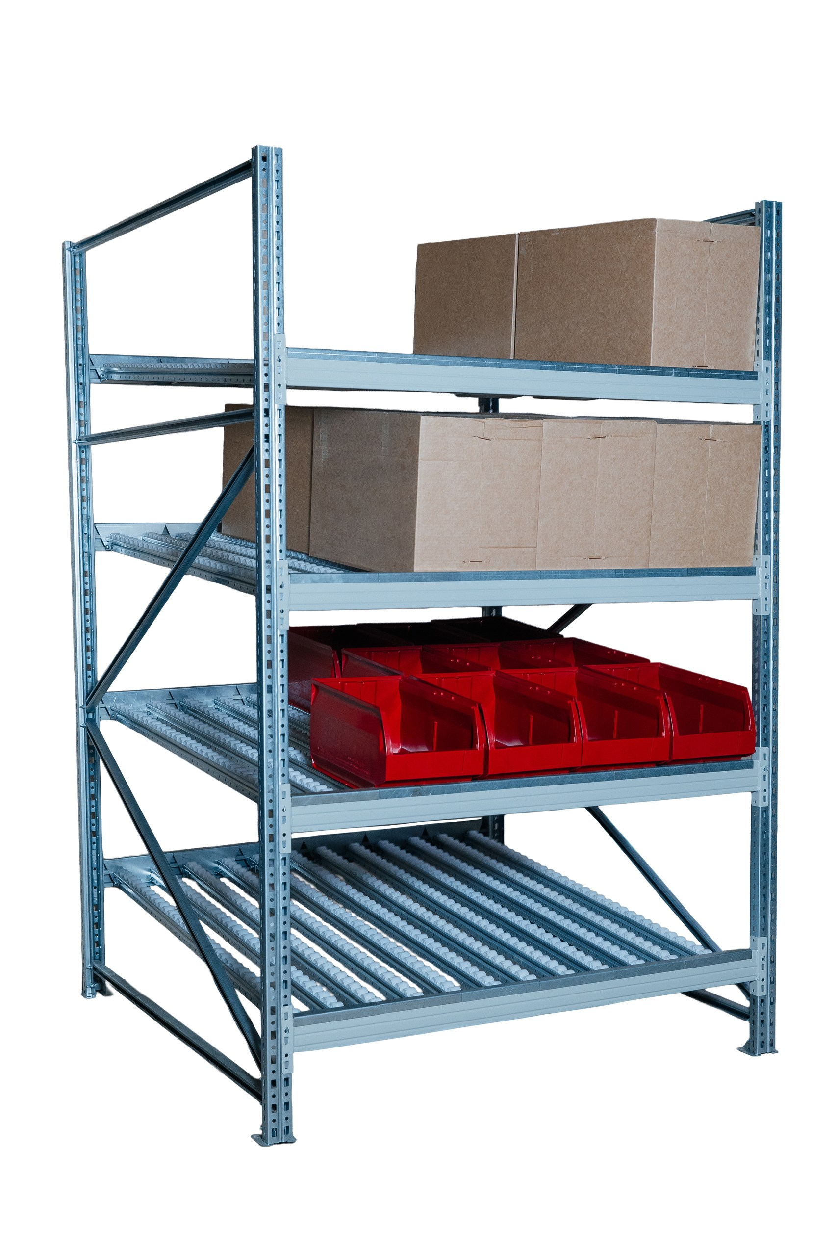 Гравитационный стеллаж с роликовыми полками 1600×900×1300 на 4 яруса подходит для хранения и отбора пластиковых ящиков, коробок и лотков в зонах комплектации, на складе и производстве.