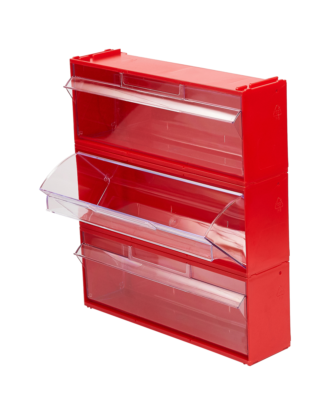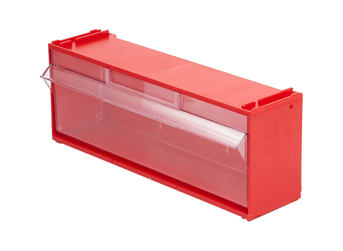Короб откидной Стелла-техник F-300-1 (300х97х112мм.), красный, прозрачный служит для хранения мелкоштучных предметов. Данная система хранения не подвержена случайному опрокидыванию. Откидная удлиненная ячейка обеспечивает быстрый доступ к необходимым предметам. В случае необходимости полного высыпания или наполнения короб легко извлекается. Полезный внутренний размер ячейки 283х65х70мм. Специальный пластик, из которого выполнен короб, выдерживает значительные нагрузки и обладает оптимальной эластичностью. На основе данных коробов можно сформировать многоярусную систему хранения, выстраивая вертикально. Данный короб, через отверстия на задней стенке, легко можно прикрепить к стене или установить на специальные кронштейны (Артикул: Кронштейны-FOX-750). Обзорность содержимого сквозь прозрачные внутренние ячейки, наличие отсека для информационных бирок, легкое извлечение внутреннего короба для опустошения и наполнения, все это является неоспоримым преимуществом откидных коробов серии F. Температура эксплуатации от -10 до +70С.