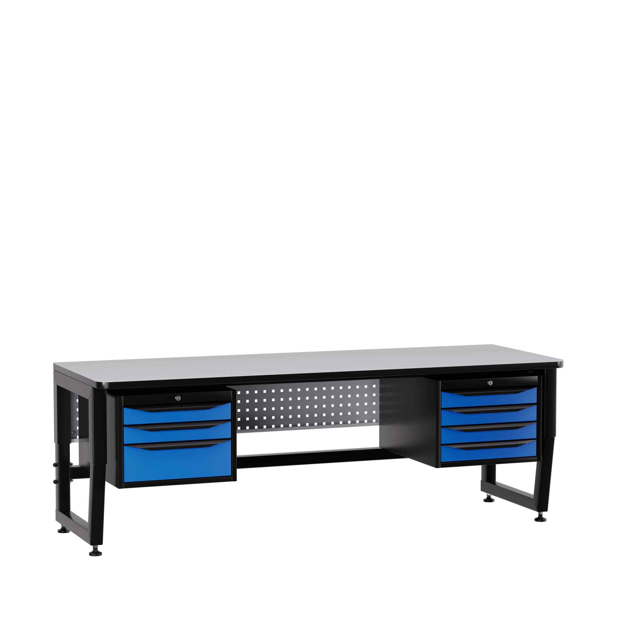 Несущая конструкция стола – это промышленный ESD каркас. Сочетание опорных, несущих и усиливающих элементов из металла, обеспечивают высокую надежность конструкции при интенсивной промышленной эксплуатации с распределенными нагрузками на рабочее место до 300 кг. Регулируемые опоры с возможностью плавной регулировки по высоте позволяют установить удобную высоту рабочей поверхности от 700мм до 850мм. Специальное ESD полимерное покрытие элементов каркаса с сопротивлением 1 МОм обеспечивают антистатические свойства изделия