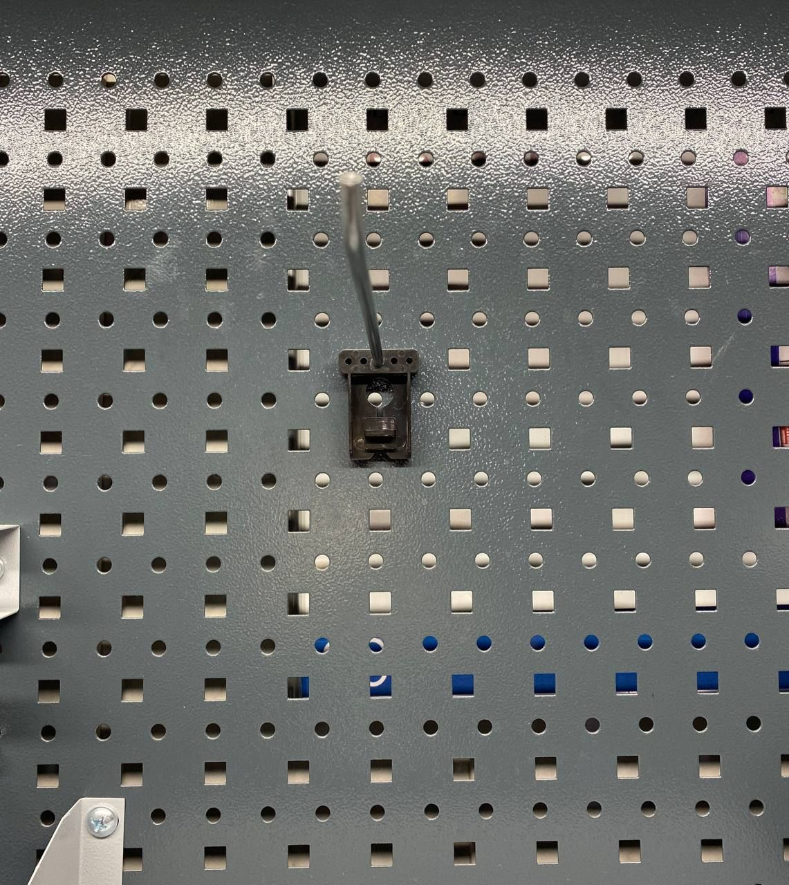 Металлические крючки. Отлично подойдут к нашей металлической мебели. Ознакомьтесь с ней на странице нашего магазина, там же Вы найдете другие навески и держатели. Крючки крепятся к перфорированной панели. Надежность крепления обеспечивается пластмассовым держателем с поворотным механизмом.