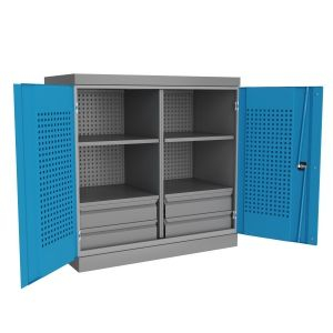 Антресоли изготовлена из листовой стали и обеспечивает надежное запирание дверей ригельной системой. Шкаф данной модели может комплектоваться либо полками Technic(1) и ящиками Technic(1) – по всей ширине шкафа, при этом максимальное количество полок и ящиков по высоте - 12 штук. При установке перегородки, шкаф делится на две части и может комплектоваться полками Technic(2) и ящиками Technic(2), при этом максимальное количество полок и ящиков по высоте - 12 штук в два ряда.