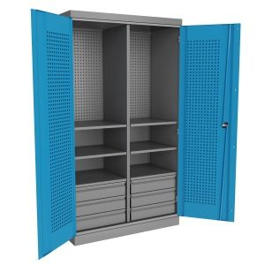 Максимальная распределенная нагрузка на шкаф составляет 400кг. Максимальная равномерно распределённая нагрузка на полку 50кг, выдвижной ящик 40кг. Шкаф оснащен замком «Евролок». Окраска элементов корпуса осуществляется порошковой полимерной краской: RAL 7037 (пыльно-серый), а дверцы RAL 5015 (небесно-синий) – складская программа, RAL 3003 (красный) – под заказ. Все шкафы отгружаются со склада в разобранном виде. Инструкцию по сборке вы можете скачать с нашего сайта.