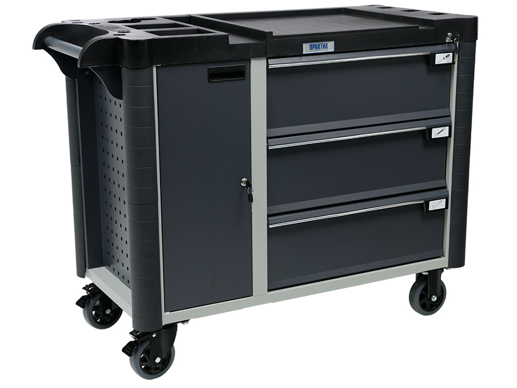 Топ (пластик черного цвета) оснащён ложементами под инструменты для организации, хранения и удобства использования во время выполнения работ. Нагрузка на ТОП – 30 кг
