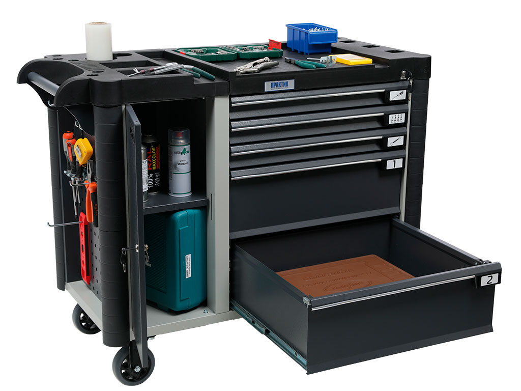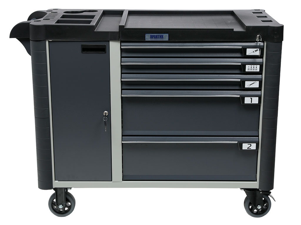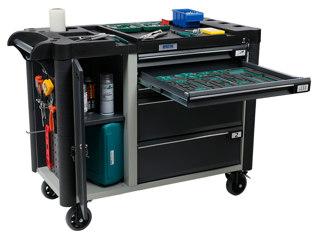 Топ (пластик черного цвета) оснащён ложементами под инструменты для организации, хранения и удобства использования во время выполнения работ. Нагрузка на ТОП – 30 кг