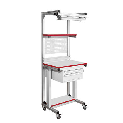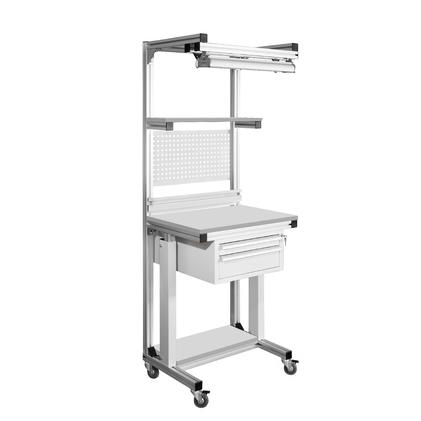 Стойка подкатная ремонтная из конструкционного профиля СР-КП — является мобильным рабочим местом, с возможностью перемещения оборудования и принадлежностей в рабочей зоне. Стойка оснащена: перфопанелью, инструментальной полкой с возможностью регулировки по высоте, нижней полкой, планкой для крепления лотков, подвесной металлической тумбой на 2 ящика, комплектом освещения светодиодным КОС-КП, четырьмя колесными опорами две из которых с механизмом фиксации. Высота стойки 1950 мм, ширина 700 мм, глубина 550 мм.