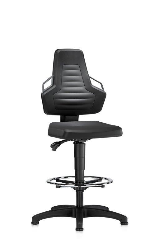 Черные полиуретановые сидения и спинка обладает высокой износостойкостью и удобны в уборке. Механическая регулировка высоты и наклона сиденья, а также угла и высоты спинки. Опорное кольцо для ног регулируется по высоте.