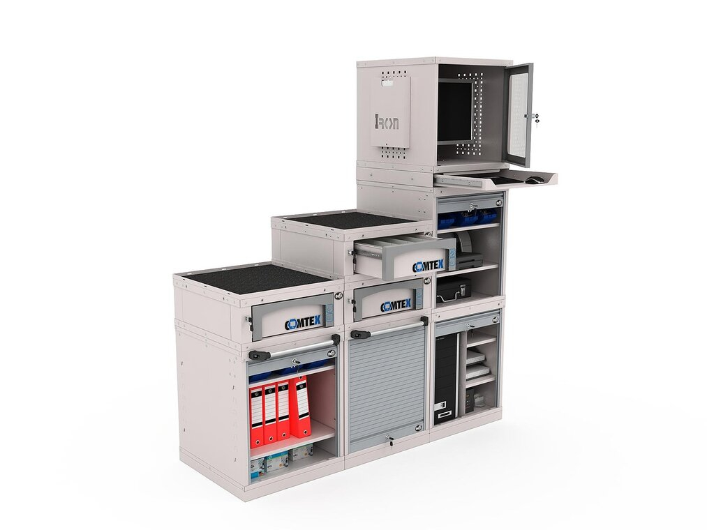 Имеют тумбы с дверьми-жалюзи верхнего открывания с замком, обеспечивающим надежное запирание.