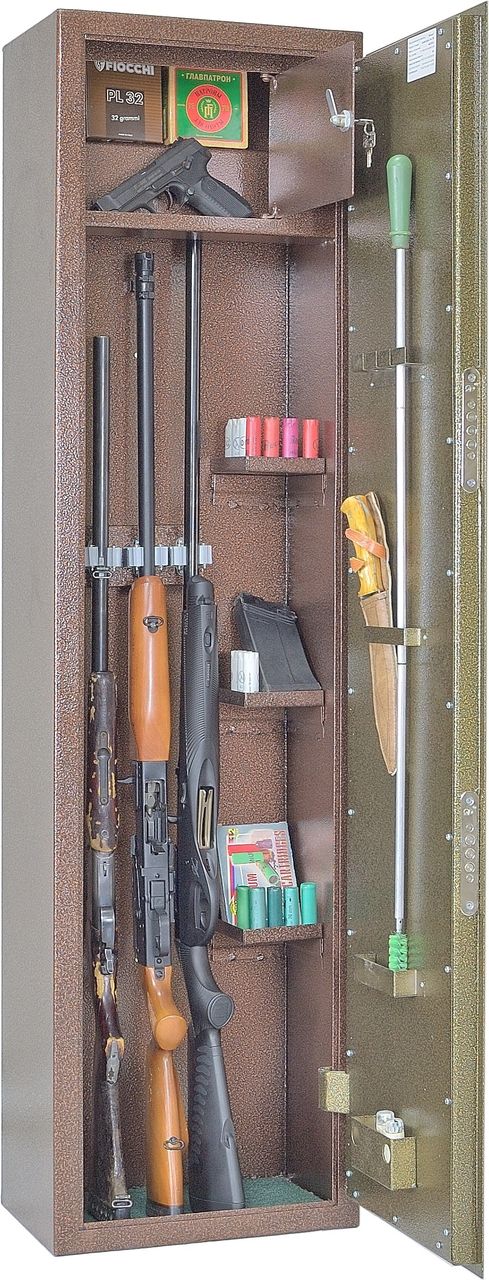 Сейф односекционный, на 4 ствола оснащен съемными полками и отделением под патроны. Ложементы — металлические держатели с резиновыми роликами. Максимальная высота устанавливаемого оружия — 1350 мм. Два замка ЗАО «Про-Сам» г. Рязань или аналогичные замки другого производителя.