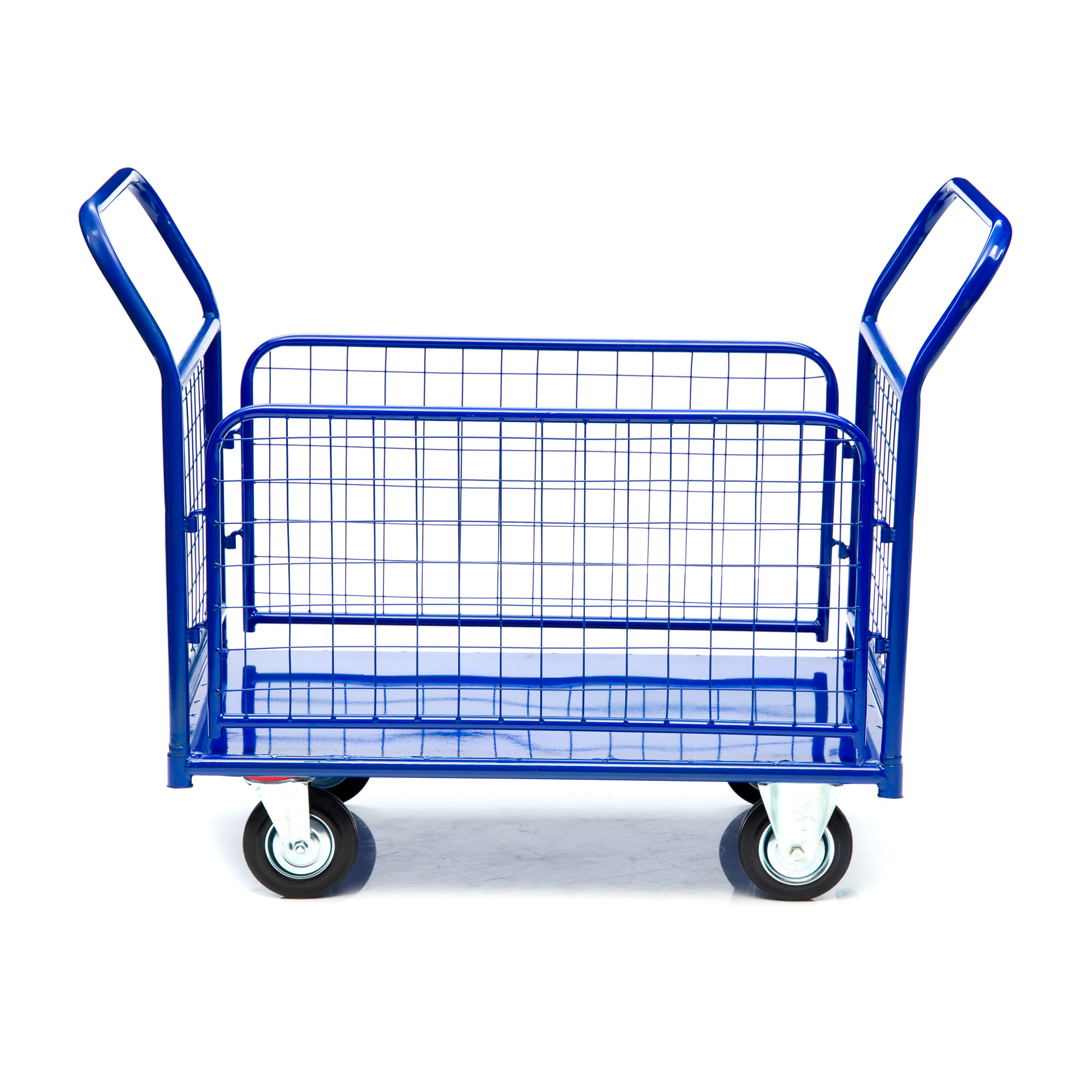 Платформенная 4-х колесная тележка с сетчатыми бортами КПО-500С используется для транспортировки различных сборных грузов на оптовых базах и складах. Размер платформы 600х1150мм., Металлический борт-сетка, с ячейками 50х50мм., защищает груз от падения и ударов, что позволяет перевозить хрупкие предметы и сборные грузы. Ручки и борта тележки снимается для удобства транспортировки и компактного хранения. Высота боковых сетчатых бортов 480мм., высота борта от платформы 500мм., высота ручки 750мм., Платформа имеет уникальную рельефную, полимерную, противоскользящую поверхность. Цвет синий, шагрень. Для легкого перемещения тележка КПО-500С комплектуется 2 поворотными и 2 неповоротными колесами, изготовленными из высококачественной литой резины.