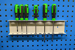 Предлагаем компактный и практичный аксессуар к верстаку — держатель для отверток. Как и все подобные приспособления, его крепят к перфорированному экрану при помощи зацепов. Это позволит разместить его там, где удобнее всего работнику.