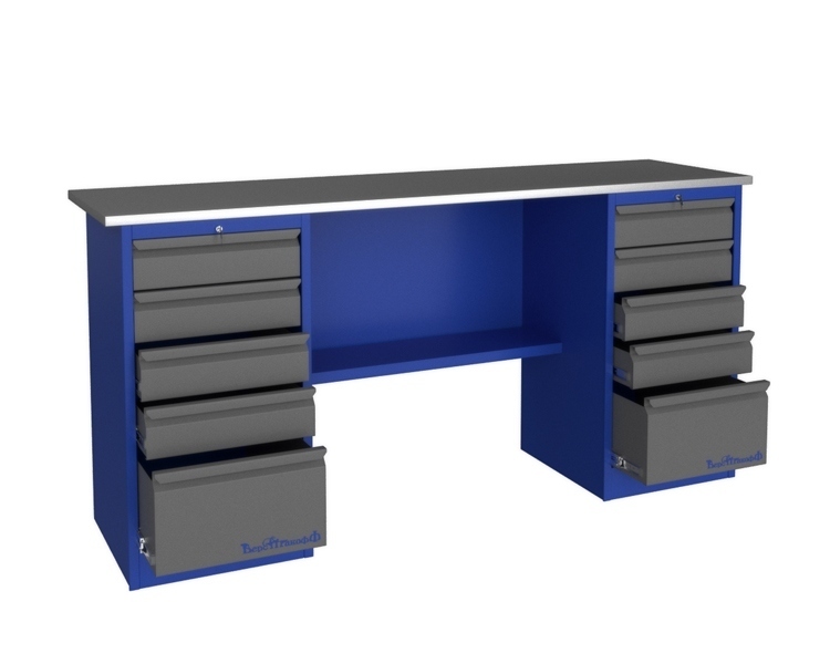 Особенность данной модели – наличие двух объемных тумб, которые и служат опорой всей конструкции. Каждая тумба оснащена пятью ящиками, центральным замком – любой инструмент будет всегда у вас под рукой. В комплектации предусмотрена нижняя полка.