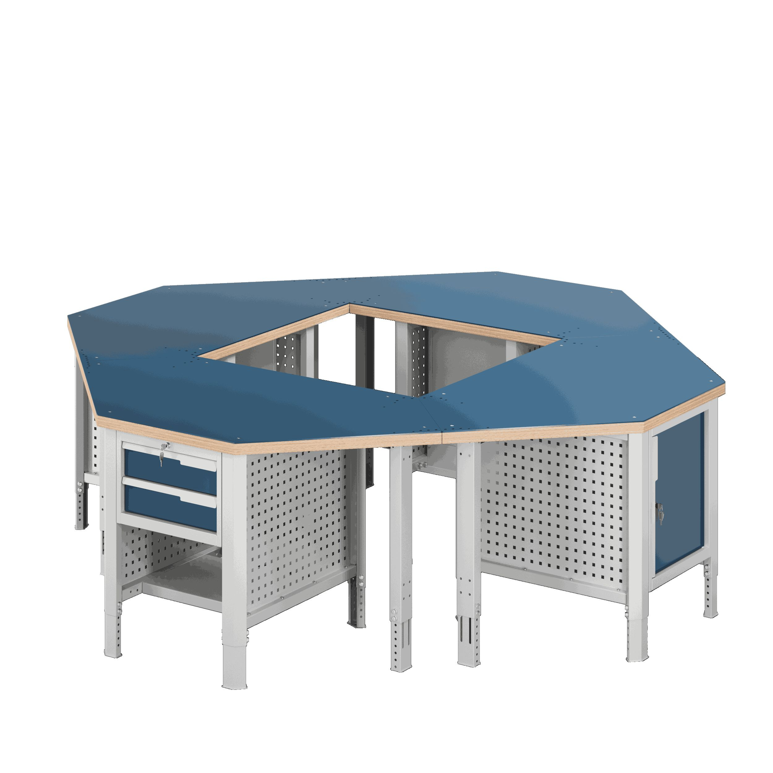 Островной верстак серии Constructor U6X, состоящий из четырех столешниц и модулей CS, представляет собой универсальное решение для создания просторного и функционального рабочего пространства. Этот верстак идеально подходит для мастерских, где требуется доступ к рабочей поверхности со всех сторон.