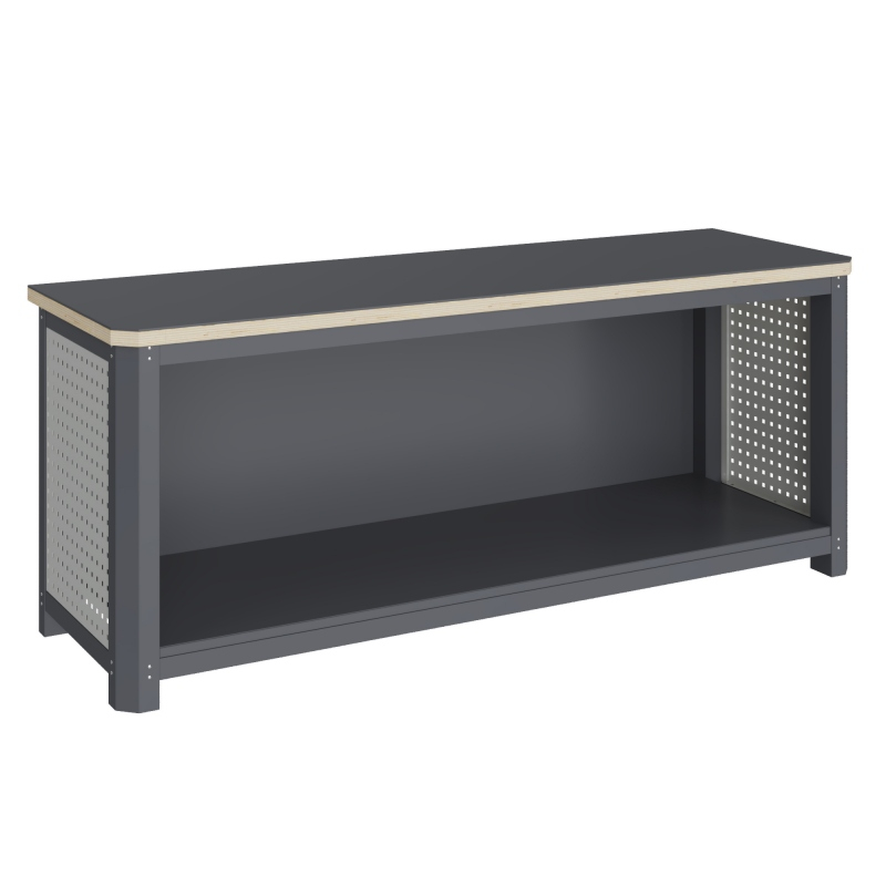Верстак серии MECHANIC: MCN 2052.0.1111 состоит из столешницы шириной 1993 мм, рамы верстака, состоящей из опор, перемычек, боковых перфопанелей, четырех комплектов полка-стенка SW1.