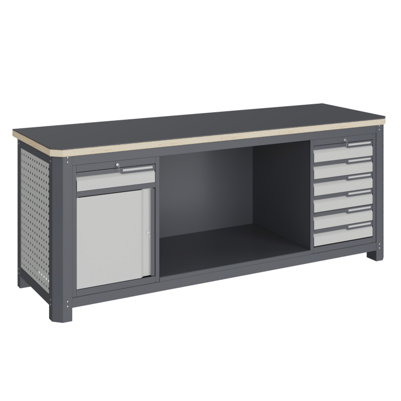 Верстак серии MECHANIC: MCN 2052.S68.11 состоит из столешницы шириной 1993 мм, рамы верстака, состоящей из опор, перемычек, боковых перфопанелей, малых модулей S6, S8 и двух комплектов полка-стенка SW1.