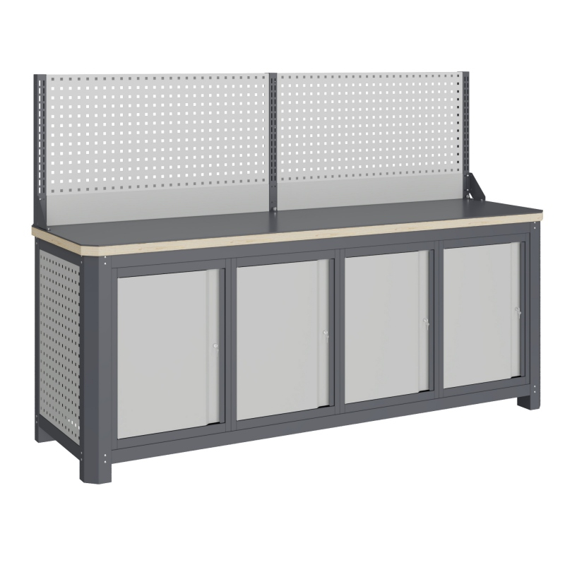 Экран (перфорированная панель) верстака выполнен с квадратной перфорацией 12х12 мм с шагом 38 мм для установки крючков, держателей и других аксессуаров. Экран крепятся к столешнице с помощью специальных кронштейнов. Максимальная масса груза, равномерно распределенного по поверхности экрана, составляет 71 кг.