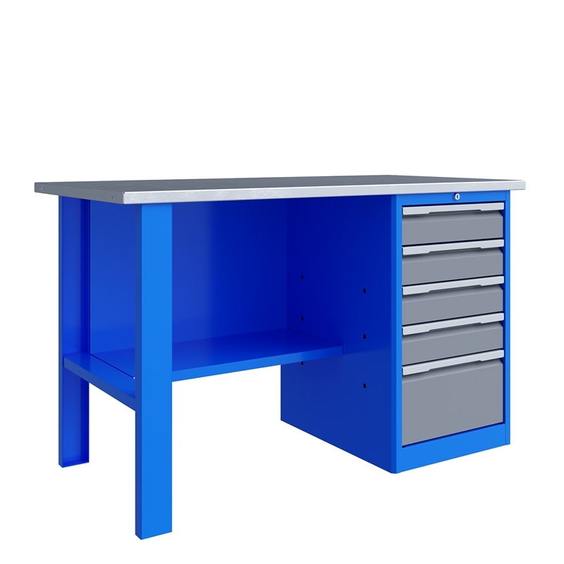 Верстак серии Technic 141.15.2 состоит из столешницы шириной 1396 мм, опоры, тумбы P5 с четырьмя малыми, одним большим ящиком и полки-стенки.