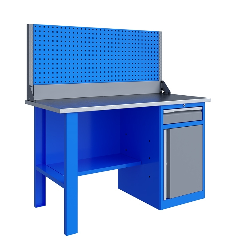 Одинарный экран (перфорированная панель) верстака выполнен с квадратной перфорацией 12х12 мм с шагом 38 мм для установки крючков, держателей и других аксессуаров. Экран крепится к столешнице с помощью специальных кронштейнов.