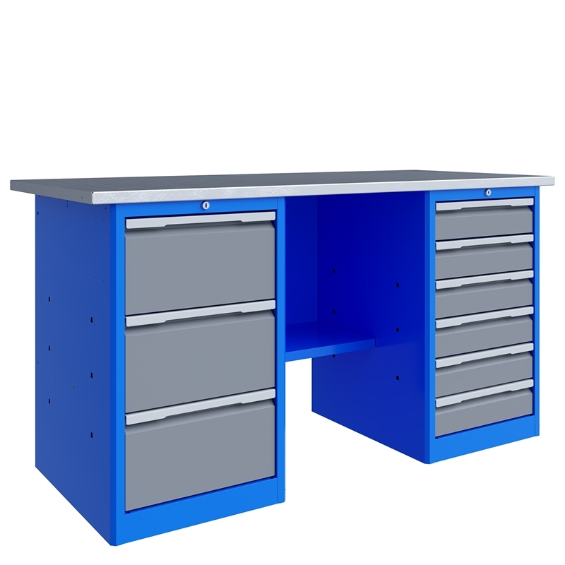 Тумбы верстаков выполнены сварными. Ящики в тумбах устанавливаются на шариковых телескопических направляющих полного выдвижения. В тумбе P3 установлено три больших ящика. В тумбе P6 установлено шесть малых ящиков. Внутренние размеры малых ящиков (ВхШхГ), не более: 103 х 397 х 520 мм. Внутренние размеры больших ящиков (ВхШхГ), не более: 222 х 397 х 520 мм. Тумбы с ящиками снабжены общим центральным замком с поворотом ригеля 180 градусов и подпружиненной тягой. В комплекте два ключа с каждой тумбой.