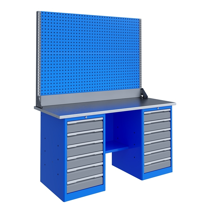 Верстак серии Technic 161.66.1-2 состоит из столешницы шириной 1596 мм, двух тумб P6 с шестью малыми ящиками, полки-стенки, двойного экрана с кронштейнами