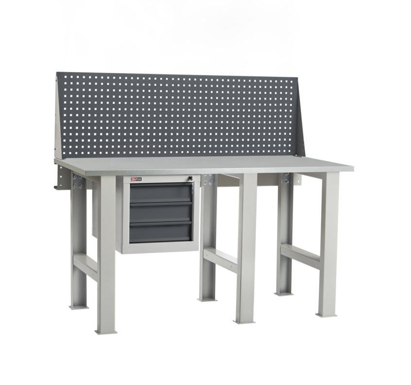 Этот верстак отличается простой устойчивой конструкцией, которая удачно дополняется привлекательным внешним видом и высокой функциональностью. Для хранения некрупных деталей или металлических изделий верстак оснащен подвесной тумбой. Для размещения прочего инструмента и материалов возможно установить дополнительные аксессуары на перфорированном экране этого верстака. Здесь можно разместить различные навесные полки, подставки, держатели для отверток или ключей и прочие изделия, которые помогают соблюдать порядок на рабочем месте.