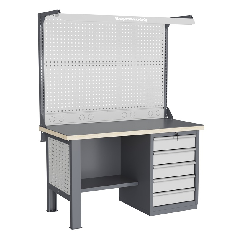 Верстак может комплектоваться одинарным или двойным перфорированным экраном, электромонтажным блоком для установки розеток и дополнительных устройств, а также комплектом освещения с держателем и лампой. Перфорация экрана подходит под стандартные держатели для инструментов, отверток, крючков, полок. Возможна комплектование верстака навесным элементами (держатели, крючки, полки).